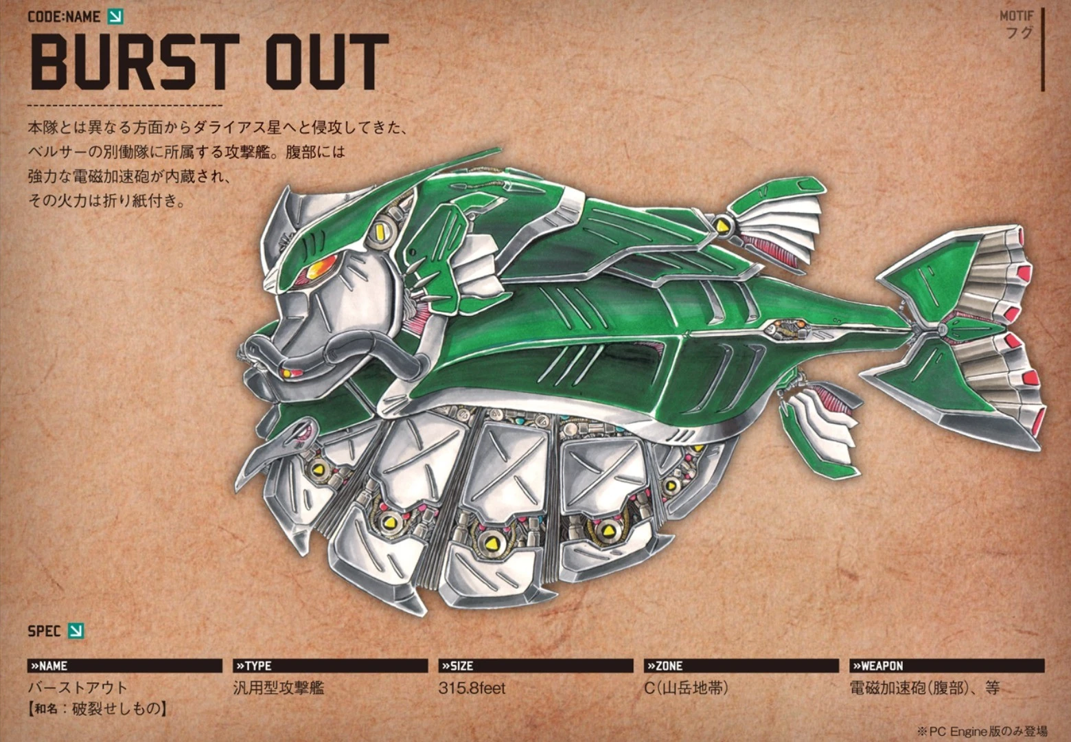 In Super Darius II, appears as a mechanical japanese puffer with a sleeker design. Its body is mainly green with metallic accents, and it has sharp fins and a strong armored head. A large silver structure is attached below its body, giving it a more compact but still powerful look.