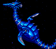Deep Dragon constantly moves on the right of the screen, stretching its neck back and forth while using all of its attacks at once. It will constantly shoot blue energy balls at the player from its tail, shoot energy waves from the frontal fin and shoot missiles from its back. Sometimes it will also fire a blue energy ball from its mouth. Its entire body is vulnerable.