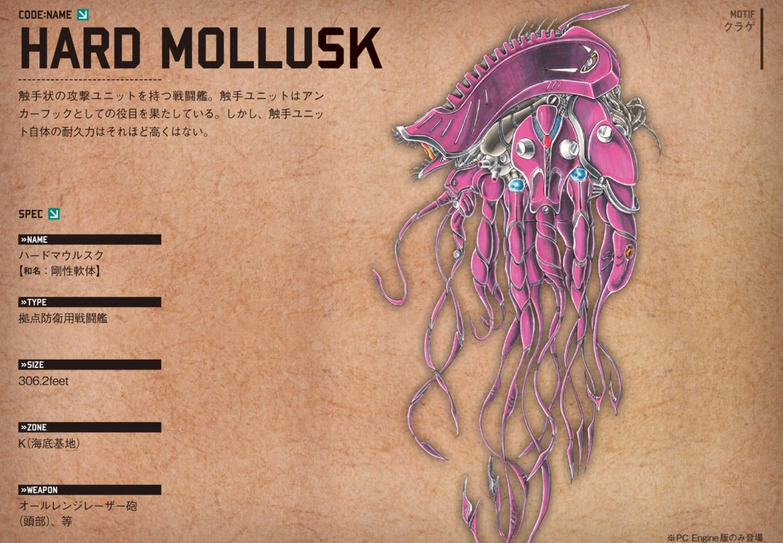 Hard Mollusk (Japanese: ハードマウルスク, Hepburn: Hādomaurusuku?) [Japanese name: rigid soft body] is a boss introduced in Super Darius. It is shaped after a Portuguese man o' war (Physalia physalis).